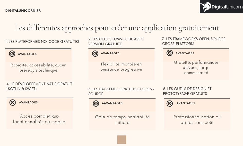 Vouloir créer une application mobile gratuitement peut venir de plusieurs raisons, comme tester une idée de start-up, lancer un projet personnel ou un MVP pour les projets futurs. Pour cela, il existe plusieurs approches possibles avec chacun leurs exigences, leurs limites et leurs avantages. Le choix dépend vos compétences techniques, vos besoins et vos objectifs. DigitalUnicorn vous les présente :