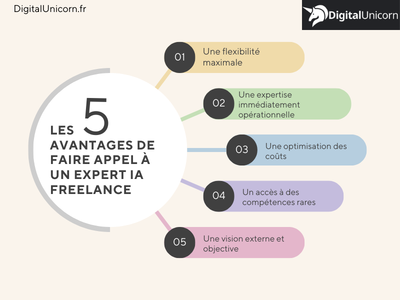 Recourir à un freelance IA ne se limite pas seulement à une question de budget, il s’agit d’un choix stratégique qui privilégie l’agilité, la qualité technique et le ROI. DigitalUnicorn vous présente ses 4 principaux avantages :