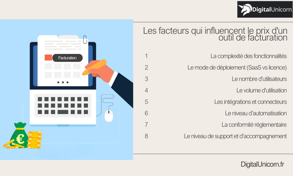 C’est pourquoi dans ce guide complet, notre agence web DigitalUnicorn vous aide à choisir et à estimer le prix d’un outil de facturation adapté pour votre entreprise. Nous vous proposons un accompagnement pour sélectionner, développer et intégrer des outils pour optimiser votre flux de travail en donnant des devis détaillés.