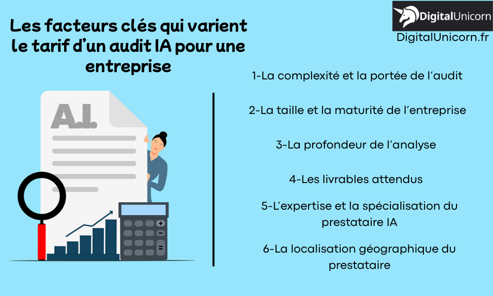 Ces facteurs peuvent influencer directement, le temps de l’audit, le niveau d’expertise requis et la qualité des livrables produits. DigitalUnicorn peut vous faire un audit de qualité pour savoir comment et pourquoi intégrer l’IA dans votre entreprise.