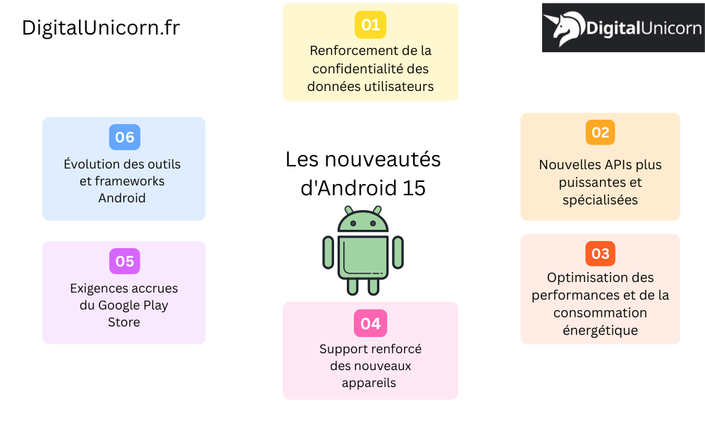 C’est pourquoi les entreprises et les porteurs de projets doivent toujours prendre en compte ces évolutions dès le départ pour éviter les explosions des budgets dus aux refontes techniques, à la mise en conformité tardive ou à la dégradation rapide de l’expérience utilisateur. Pour vous aider à bien anticiper cette mise à jour, notre agence mobile DigitalUnicorn, spécialisée en accompagnement d’entreprise pour répondre à ces besoins, vous présente les impacts d’Android 15 sur le coût de développement et de maintenance d’application en 2026.