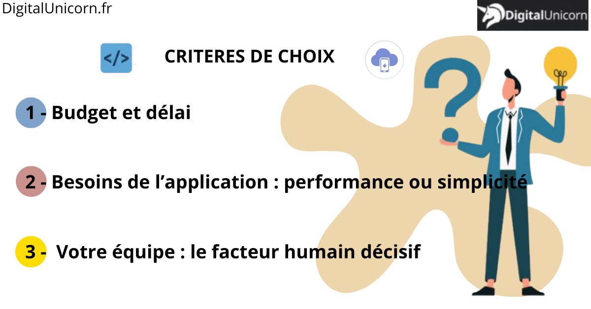 La première question à se poser ? Combien va vous coûter la création de votre application mobile en fonction de la technologie choisie. Sachez que le natif coûte plus : deux apps, deux équipes, deux maintenances. Mais le résultat est plus solide, plus rapide et plus facile à scaler.